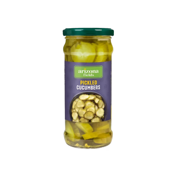 Arizona Fields Pickled Cucumber offers crisp texture with a tangy-sour bite, soaked in a spiced brine for the perfect side to desi and continental meals alike. Order Arizona Fields Pickled Cucumber 370g Jar and enjoy a zesty crunch!