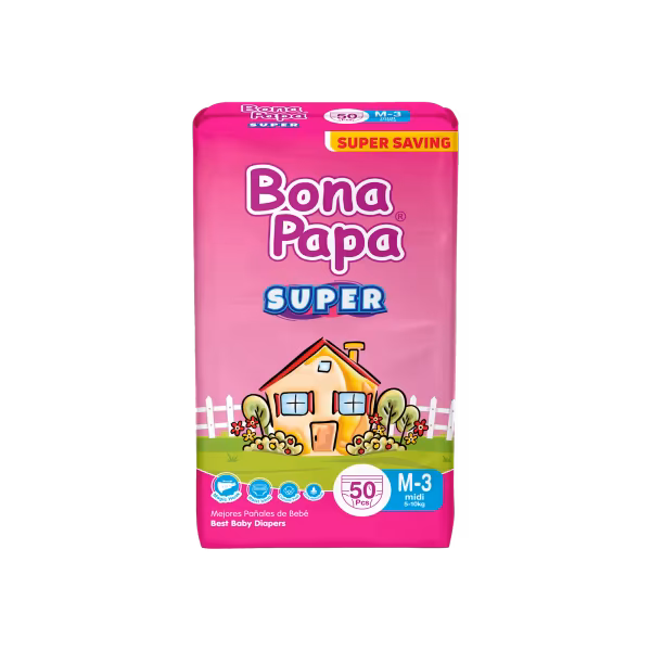 Bona Papa Super Size 3 diapers offer a snug fit and excellent absorbency for active babies. Ideal for active babies, these diapers provide all-day comfort and protection, so you can focus on the moments that matter. Buy Bona Papa Super Size 3 (50 Pieces) for comfort and care in every diaper!