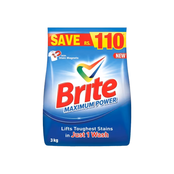 Brite Max Washing Powder delivers powerful cleaning for large loads, removing tough stains and keeping clothes fresh and bright. It dissolves easily in both warm and cold water, providing long-lasting freshness. Get Brite Max Washing Powder 3kg for an efficient and fresh laundry routine!