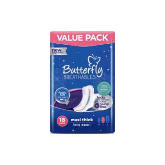 Butterfly Breathables Maxi Thick Fabric Soft Long Sanitary Pads provide all-day comfort and absorption. Designed with breathable layers and soft fabric. Reliable protection on heavy days. Buy Butterfly Breathables Maxi Thick Fabric Soft Long Value Pack Sanitary Pads (18 Pieces) and stay confidently protected!