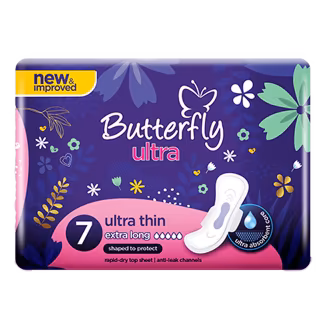 Butterfly Ultra Thin Extra Long Pack Sanitary Pads are slim, breathable, and built for extended protection. Comfortable for daily wear. Shop Butterfly Ultra Thin Extra Long Pack Sanitary Pads (7 Pieces) and stay worry-free all day!