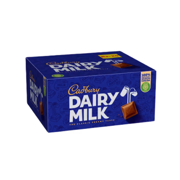 Cadbury Dairy Milk is a small yet indulgent chocolate bar for a quick cocoa fix. An ideal treat for everyone. Order Cadbury Dairy Milk Rs. 30 Box (24 Packs) for a creamy, rich quick fix!
