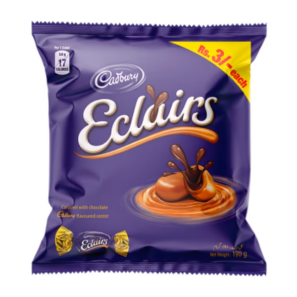 Cadbury Eclairs is soft and chewy caramel filled with rich, creamy chocolate texture. A treat that melts your worries away. Order Cadbury Eclairs Pouch Rs. 3 (50 Pieces) and let it turn your day around!