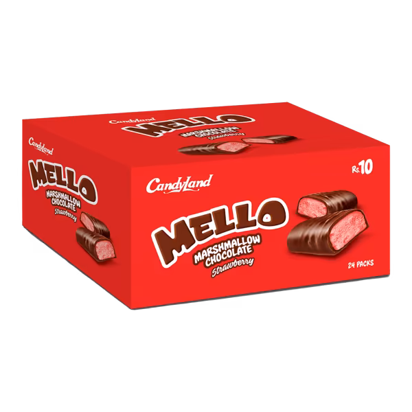 Candyland Mello Bar Strawberry is a soft and fluffy marshmallow bar infused with sweet strawberry flavor. Toast or dip in chocolate as per your preference. Buy Candyland Mello Bar Strawberry Rs. 10 Box (24 Packs) and experience the fluffy warmth!