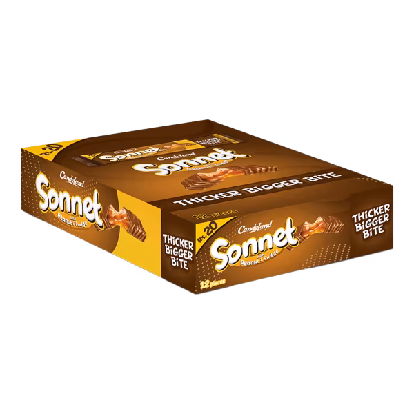 Candyland Sonnet Chocolate is a sensational chocolate bar with a creamy, melt-in-your-mouth texture. Shop Candyland Sonnet Chocolate Rs. 20 Pack (12 Packs) for an indulgent bite!