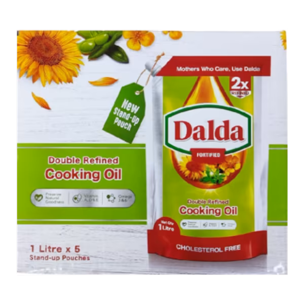Dalda Cooking Oil is enriched with Vitamins A and D, ideal for everyday cooking. Light in texture and neutral in taste. Packaged in an easy-pour pouch. Order Dalda Cooking Oil Standup 1L Carton (Pouch x 5) and cook with confidence!