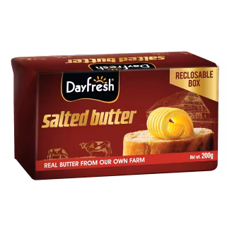 Dayfresh Salted Butter is churned from fresh cream and lightly salted to perfection, delivering a rich and creamy taste. Ideal for cooking, baking, or simply spreading on warm bread. Buy Dayfresh Salted Butter 200g Pack online and add a touch of richness to your meals.
