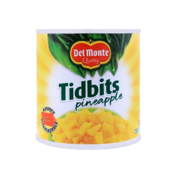 Del Monte Pineapple Tidbits features small, bite-sized pineapple chunks in syrup, perfect for snacking, cooking, or adding to fruit salads. Buy Del Monte Pineapple Tidbits 432g Tin online for sweet, tropical flavor in every bite-sized piece.