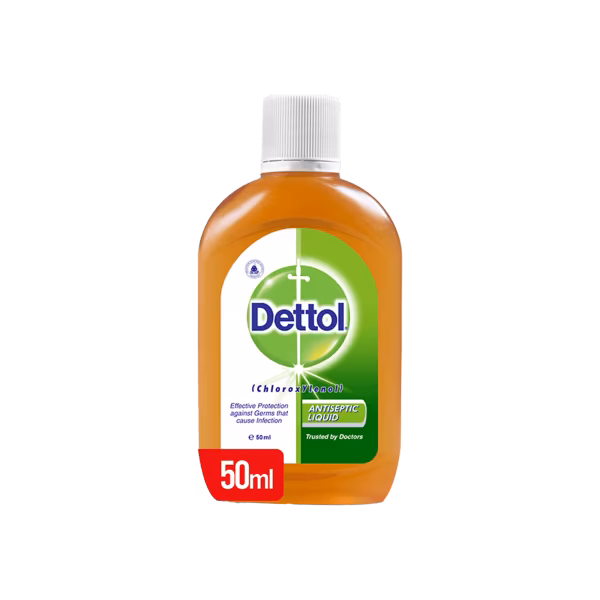 Dettol Antiseptic Liquid disinfects wounds, surfaces, and protects against infections. Trusted by families for generations. Multipurpose and effective. Buy Dettol Antiseptic Liquid 50ml and protect with every drop!