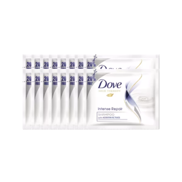 Dove Intense Repair Shampoo restores damaged hair, leaving it soft and strong. Convenient sachets make it easy to use anywhere. Get Dove Shampoo Intense Repair 12ml Sachet (Pack of 16) for healthy, strong hair!