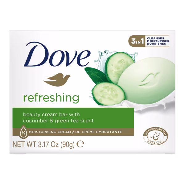 Dove Soap Refreshing Cucumber and Green Tea Scent offers a cooling cleanse with the refreshing essence of green tea and cucumber. It gently washes away impurities while leaving skin hydrated and lightly scented. Shop Dove Soap Refreshing Cucumber and Green Tea Scent 90g and stay fresh with every bath!