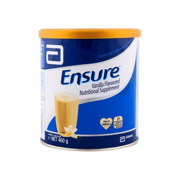 Ensure Nutritional Supplement Powder Vanilla supports daily health with essential nutrients, protein, and energy. The creamy vanilla flavor makes it an easy addition to any lifestyle or recovery routine. Order Ensure Nutritional Supplement Powder Vanilla 400g and nourish every day with balance!