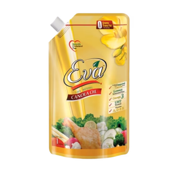 Eva Canola Oil provides a smooth and cholesterol-free cooking experience. Perfect for everything from quick meals to elaborate feasts. Buy Eva Canola Oil 1L Stand-up Pouch and fuel your kitchen with the healthiest oil for flavor-packed meals!