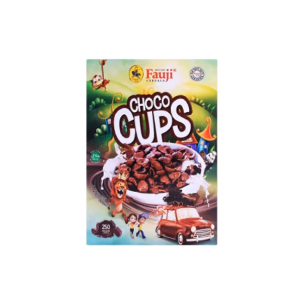 Fauji Choco Cups are crunchy chocolate-flavored cereal cups that combine great taste with essential nutrients. Fortified with calcium and iron, theyre perfect for breakfast or snacking. Order Fauji Choco Cups 250g Box online and enjoy the perfect mix of taste and nutrition.
