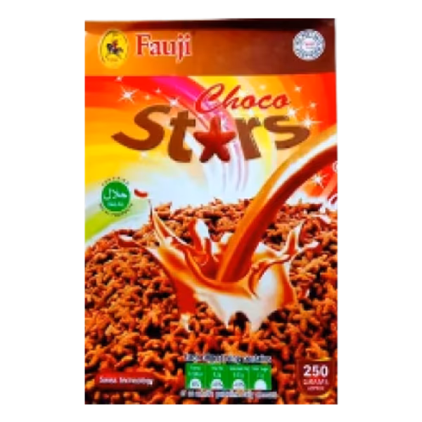 Fauji Choco Stars are star-shaped chocolate cereals made with wholesome grains and packed with essential nutrients. Theyre a breakfast kids look forward to every day. Get Fauji Choco Stars 250g Box online and brighten up breakfast with chocolatey goodness.