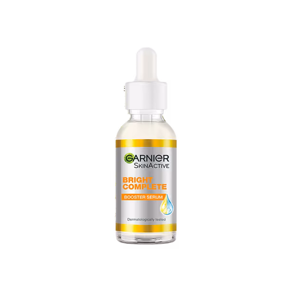 Garnier Skin Active Bright Complete Vitamin C Booster Serum brightens and evens skin tone. Enriched with Vitamin C to fade dark spots. Lightweight and fast absorbing. Get Garnier Skin Active Bright Complete Vitamin C Booster Serum 30ml and reveal glowing skin!