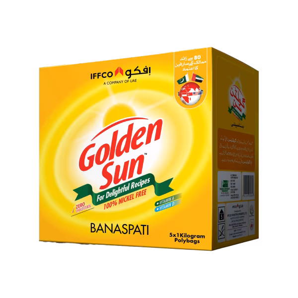 Golden Sun Banaspati Ghee enhances the aroma and taste of traditional meals, delivering a rich and authentic cooking experience. Buy Golden Sun Banaspati Ghee 1kg Carton (Pack of 5) for premium flavor, and make every dish unforgettable!