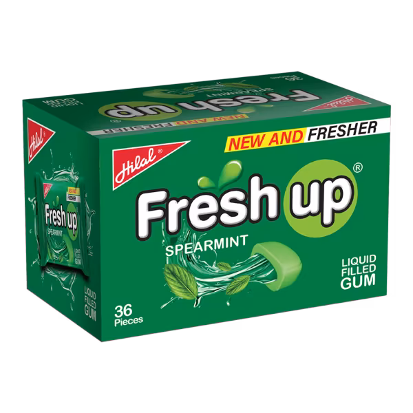 Hilal Fresh Up Spearmint offers long-lasting freshness with a sweet minty burst. A chewy treat to keep your breath fresh on the go. Get Hilal Fresh Up Spearmint Box Rs. 3 (Pack x 36) and refresh with every chew!