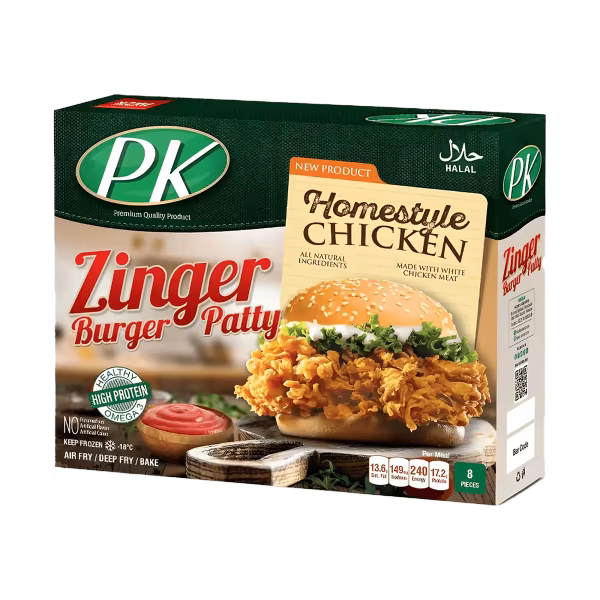 PK Home Style Zinger Burger Patty gives you crispy, juicy burgers at home. Just fry and serve with buns, sauces, and veggies. Order PK Home Style Zinger Burger Patty (8 Pieces) and serve fast-food delight!