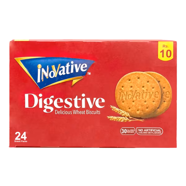 Innovative Digestive Biscuit is light, crunchy, and good for digestion. Ideal with tea or as a healthy snack. Tasty and wholesome. Shop Innovative Digestive Biscuit Box Rs. 10 (24 Pieces) and snack smartly!