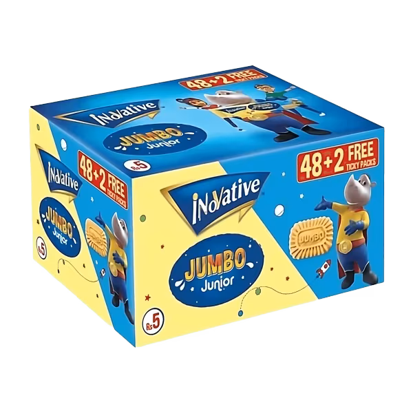 Innovative Jumbo Junior Biscuit is a fun, crispy snack packed with kid-friendly flavour. A lunchbox favourite with a light, crunchy texture. Buy Innovative Jumbo Junior Biscuit Rs. 5 (Pack x 48) and snack the fun way!