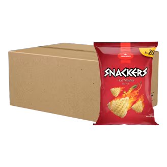 Kolson Snackers Hot Masala are crunchy potato chips coated in bold desi spices. They deliver a fiery kick with every bite. Perfect for spice lovers and snack time cravings. Buy Kolson Snackers Hot Masala Rs. 20 Carton (Pack x 60) and turn up the heat!