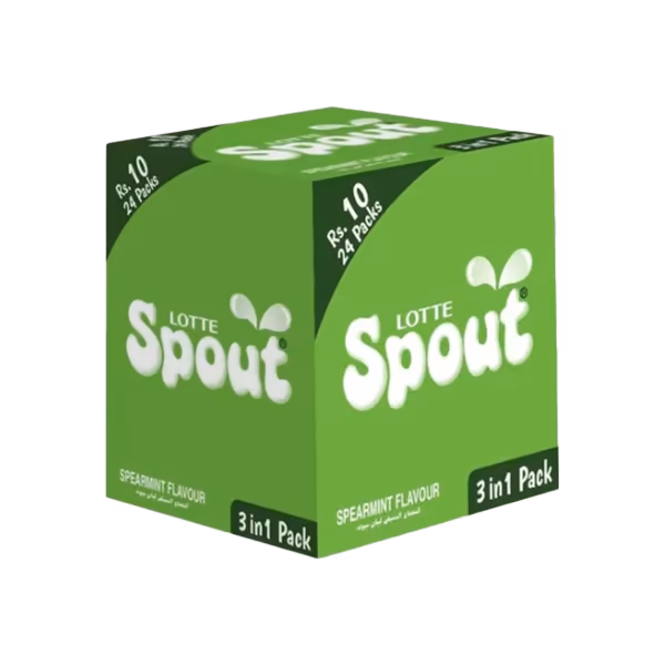Lotte Spout Spearmint 3 in 1 offers cool minty flavour in a long-lasting chewy gum. It freshens your breath instantly and keeps your mouth feeling clean. Ideal for daily use. Buy Lotte Spout Spearmint 3 in 1 Box Rs. 10 (Pack x 24) and stay minty all day!