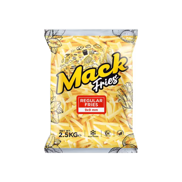 Mack Regular Fries are classic-cut frozen fries ready to bake or fry. Crispy on the outside and fluffy inside. A perfect side for meals and snacks. Shop Mack Regular Fries 2.5kg and enjoy crisp golden bites!