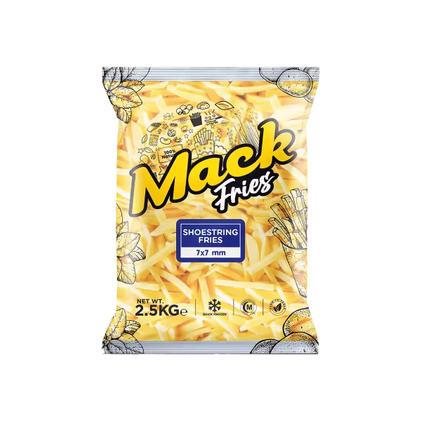 Mack Shoestring Fries are thin-cut and crispy, made for quick frying and consistent crunch. They cook evenly and turn golden brown every time, making them perfect for snacking or pairing with meals. Loved by kids and adults alike. Buy Mack Shoestring Fries 2.5kg and enjoy golden crisp fries at home!