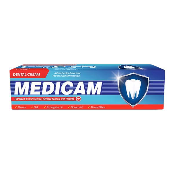 Medicam Dental Cream offers complete oral care with anti-bacterial agents and fluoride protection. It strengthens enamel, fights cavities, and keeps your breath fresh. Buy Medicam Dental Cream 90g and smile with all-day confidence!
