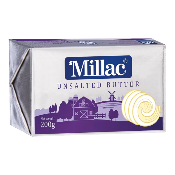 Millac Unsalted Butter provides a smooth, creamy texture, made with high-quality cream and no added salt. It is ideal for larger families or frequent use. Order Millac Unsalted Butter 200g Pack and add rich, buttery goodness to your meals!