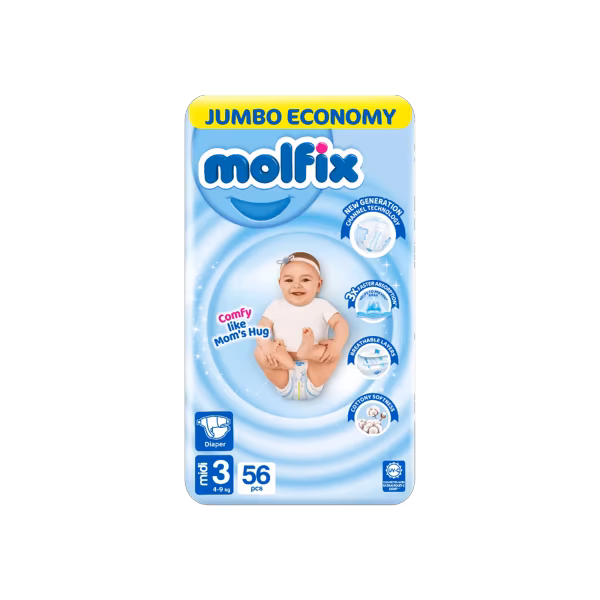 Molfix Diapers provide maximum absorbency and flexibility for toddlers. They're soft, breathable, and keep your baby dry for hours. The economy pack lasts longer. Order Molfix Diapers Size 3 Jumbo Economy (56 Pieces) and enjoy worry-free diapering!