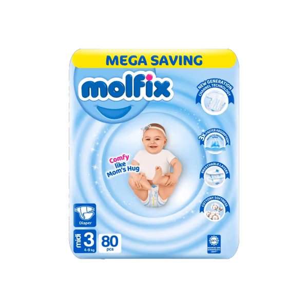 Molfix Diapers Size 3 Mega Pack offers all-day protection with its super-absorbent core, providing a secure fit that stays in place, while the absorbent design locks in moisture for long-lasting dryness, even during naps. Buy Molfix Diapers Size 3 Mega Pack (80 Pieces) for all-day comfort, no matter what!