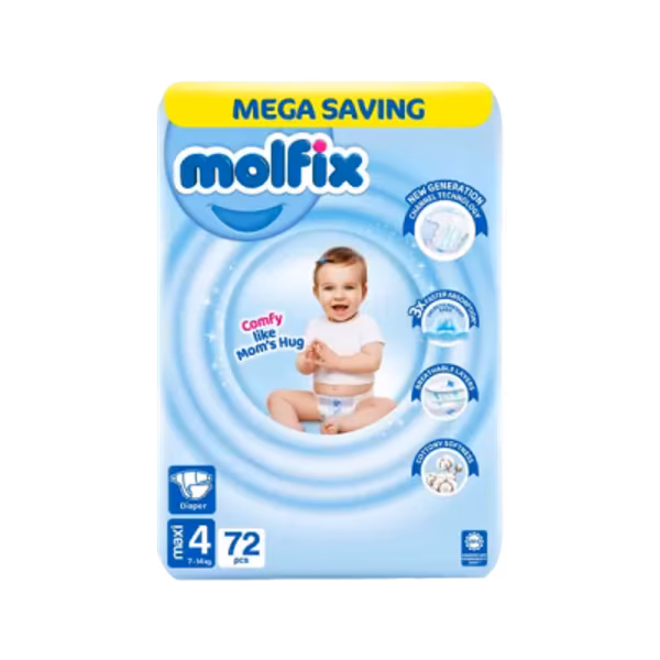 Molfix Diapers Size 4 provide ultimate dryness and soft comfort, ensuring leak protection for longer hours, so your baby can enjoy their playtime without any interruptions. Buy Molfix Diapers Size 4 Mega Pack (72 Pieces) for worry-free baby care!