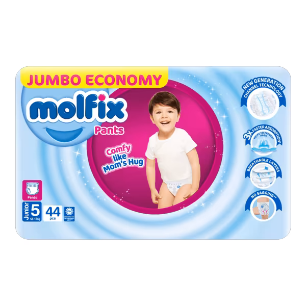 Molfix Pants Size 5 Jumbo Pack ensures quick absorption and a secure fit for active babies. Prevents irritation and allows for all-day comfort, while the absorbent core locks in moisture, making them ideal for long hours of play or sleep. Buy Molfix Pants Size 5 Jumbo Pack (44 pcs) to support your babys playtime!