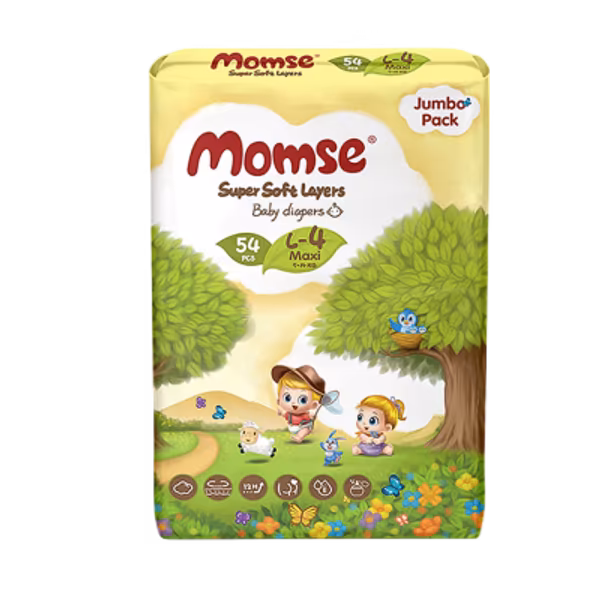 Momse Size 4 Jumbo Pack delivers premium leakage control and softness for your babys delicate skin. With an extra-soft, cotton-like feel, these diapers gently hug your babys skin, while the flexible waistband ensures a snug, customized fit Buy Momse Size 4 Jumbo Pack (54 Pieces) for the ideal balance of comfort, and protection!
