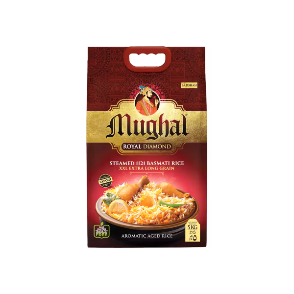 Mughal Royal Diamond Rice offers the finest Daaghi Basmati rice grains with superior length and delicate fragrance. Ideal for special occasions or daily meals, it cooks to light, fluffy perfection every time. Buy Mughal Royal Diamond Rice 5kg for premium quality rice that elevates every meal!