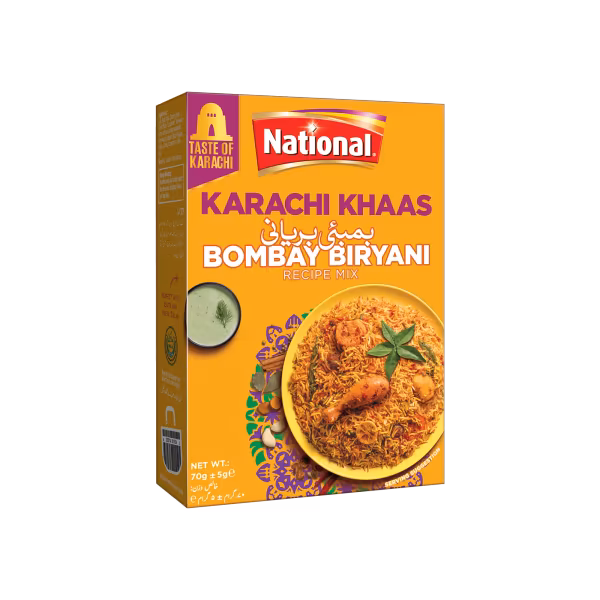 National Bombay Biryani Masala Karachi Khaas is a perfect blend of fiery red chili, warm cinnamon, zesty dried plum, and aromatic cumin, this masala adds the perfect punch to your biryani. Get National Bombay Biryani Masala Double Pack Karachi Khaas for a flavorful, authentic Bombay biryani every time!