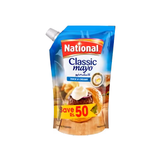 National Classic Mayo is creamy, smooth, and delicious. Perfect for sandwiches, salads, and dips with a touch of indulgence. Buy National Classic Mayo 900g (Save Rs. 50) for creamy perfection!
