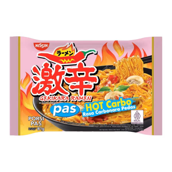 Nissin Hot Carbo Ramen Mini combines spicy carbonara flavor with chewy noodles. A fiery twist on creamy comfort food in a handy size. Buy Nissin Ramen Hot Carbo Mini 81g and spice up snack time!