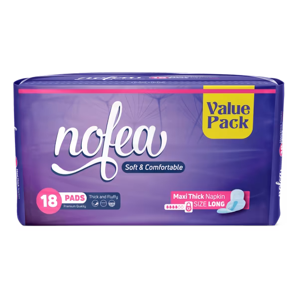 Nofea Maxi Thick Long Value Pack Sanitary Pads offer superior absorption and long-lasting protection. Designed for heavy flow days with comfort in mind. Buy Nofea Maxi Thick Long Value Pack Sanitary Pads (18 Pieces) and stay protected with ease!