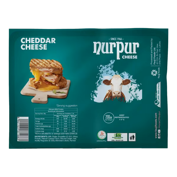 Nurpur Cheddar Cheese delivers a sharp and creamy flavor ideal for snacks, baking, or topping. Firm texture and rich in dairy goodness. Locally crafted with premium ingredients. Order Nurpur Cheddar Cheese 200g and enjoy cheesy indulgence!