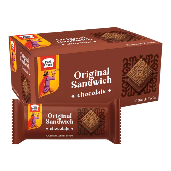 Peek Freans Chocolate Sandwich Biscuits feature a creamy chocolate filling between two crisp biscuits, delivering a rich and indulgent taste. Buy Peek Freans Chocolate Sandwich Biscuits Rs. 20 Box (16 Packs) for a delightful chocolate treat!