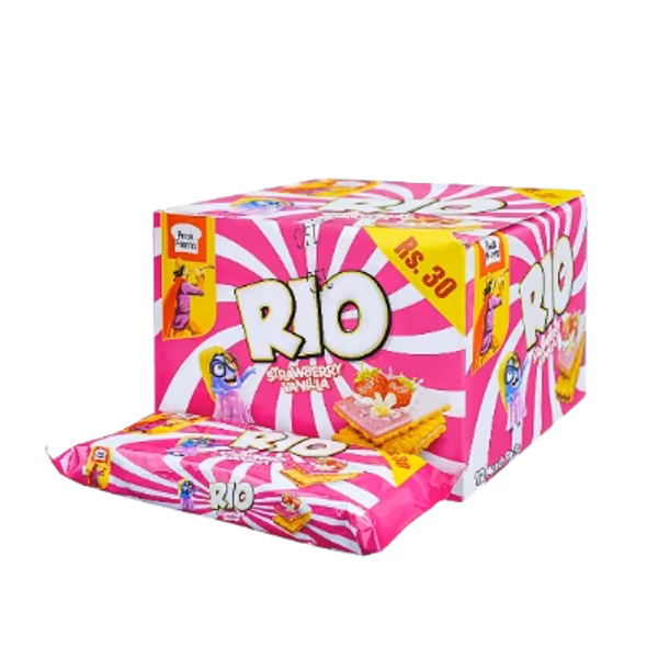 Peek Freans Rio Strawberry Vanilla Biscuits feature a delicious duo of creamy strawberry and vanilla filling between crispy biscuits. Order Peek Freans Rio Strawberry Vanilla Biscuits Rs. 30 Box (12 Packs) for a fruity and creamy delight!