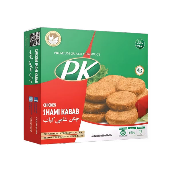 PK Chicken Shami Kebab is made from minced chicken blended with spices for traditional flavour. Ready-to-fry and perfect for quick snacks or meals. Get PK Chicken Shami Kebab (17 Pieces) and enjoy desi delight at home!