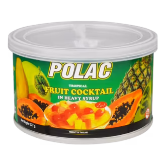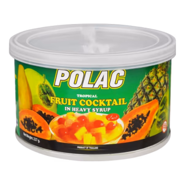 Polac Fruit Cocktail offers a delicious mix of fruits in syrup, perfect for enjoying as a snack, topping desserts, or adding to fruit salads. Get Polac Fruit Cocktail 227g Tin online for a sweet, refreshing treat in every bite.