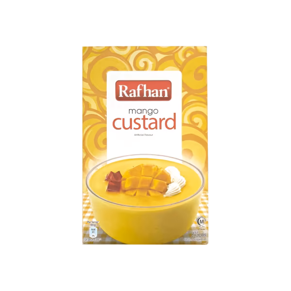 Rafhan Custard Mango brings creamy delight blended with fruity mango flavour. A favourite for family desserts and gatherings. Get Rafhan Custard Mango 275g and serve smiles in a bowl!