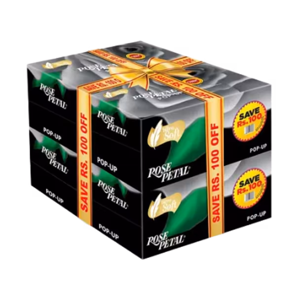 Rose Petal Pop Up Tissue Box 150 x 2 Ply (3+1) comes with 3 boxes of 150 tissues each, along with a bonus pack. Made from 2-ply material for enhanced strength and softness. Buy Rose Petal Pop Up Tissue Box 150 x 2 Ply (3+1) online for a convenient and bonus tissue offer.