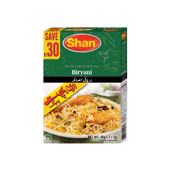 Shan Biryani Masala is a rich spice blend that helps you cook authentic biryani at home. Packed with flavor to make meals special. Buy Shan Biryani Masala 90g Double Pack (Save Rs. 30) for delicious biryani!