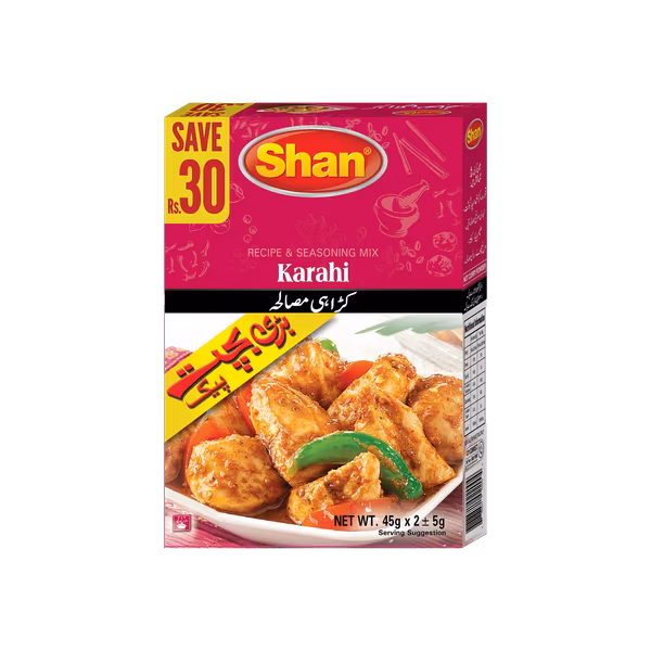 Shan Chicken Karahi Masala brings the irresistible taste of spicy, tomato-rich karahi right to your kitchen. Easy to cook, delicious to enjoy. Order Shan Chicken Karahi 90g Double Pack (Save Rs. 30) for a flavorful feast!
